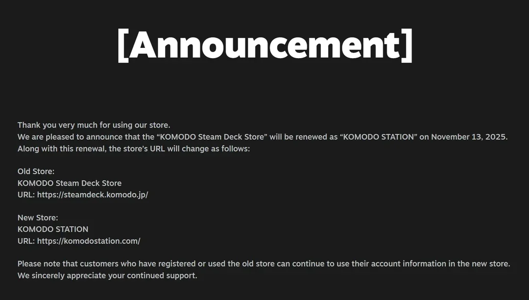 Second, Komodo—the official distributor for the Steam Deck in Asia—sent out an "Announcement". They're "renewing" their store. The "KOMODO Steam Deck Store" is becoming... "KOMODO STATION".